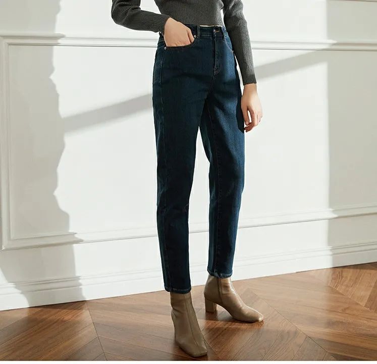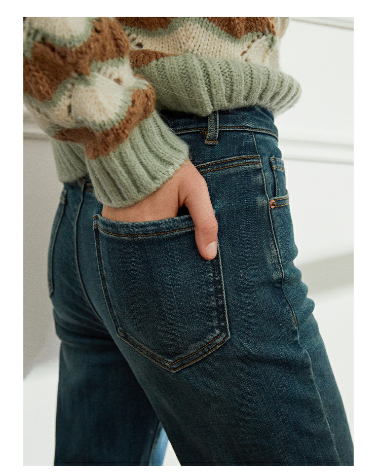 这条裤子还运用了干纺超细异性截面技术,使面料的蓬松度更高。这样也可以让牛仔裤多次洗过之后,也依然保暖亲肤,不会像普通牛仔裤一样,越洗越硬!
