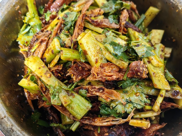 咱们手撕兔是开袋即食的,可以撕开加点黄瓜香菜这些喜欢的配菜拌一拌。拌的时候不用再调味了,直接把袋子里面剩的红油倒进去,味道就很足了~
