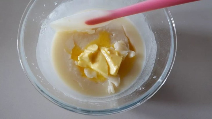 盖上保鲜膜,蒸锅蒸制30-40分钟,表面凝固即可,揭开保鲜膜,将黄油添加进去,待面团晾至室温后,将黄油揉入面团中
