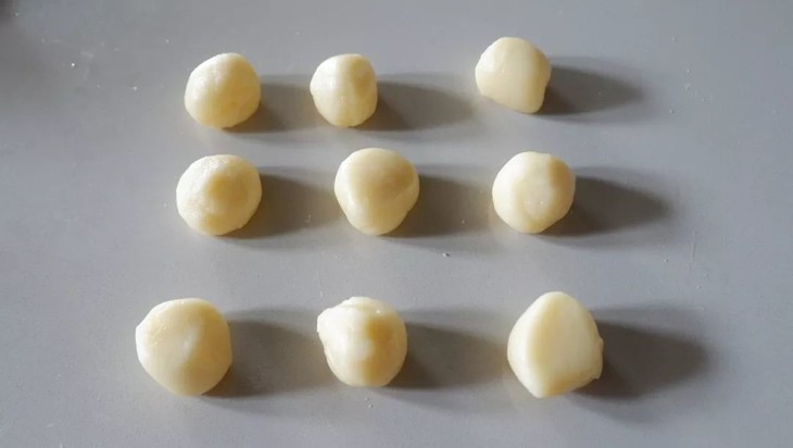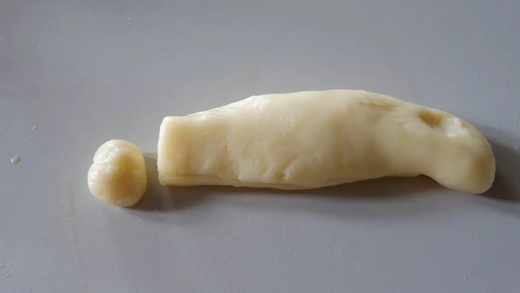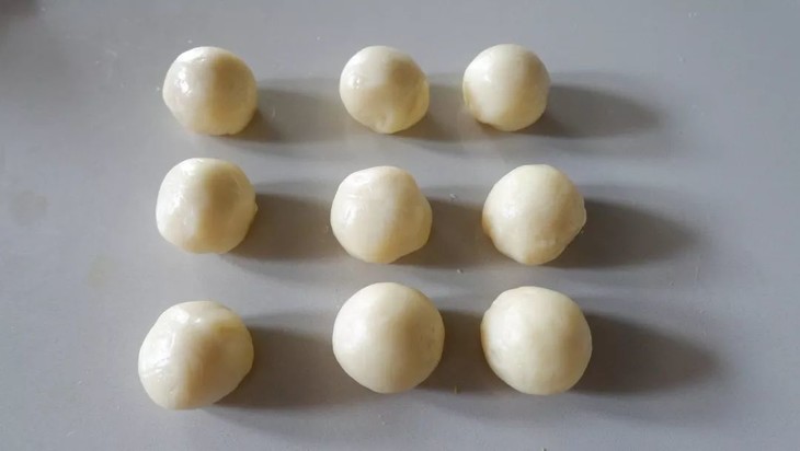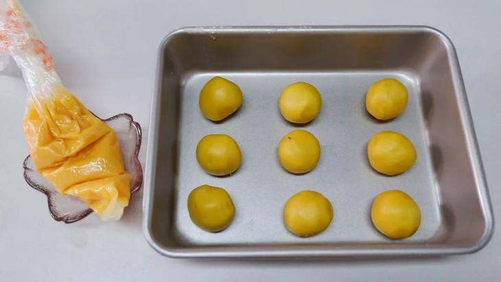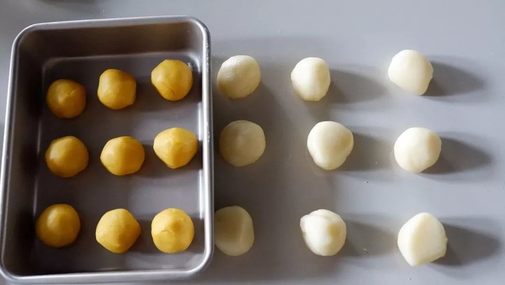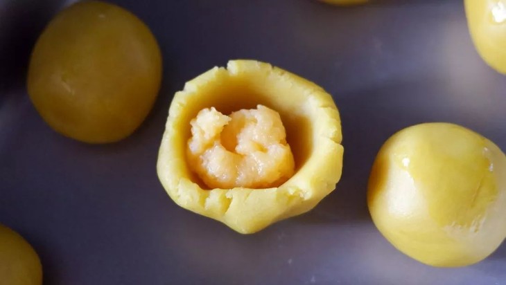 倒入裱花袋中,冷藏备用,将奶黄莲蓉馅分割,平均每份20g