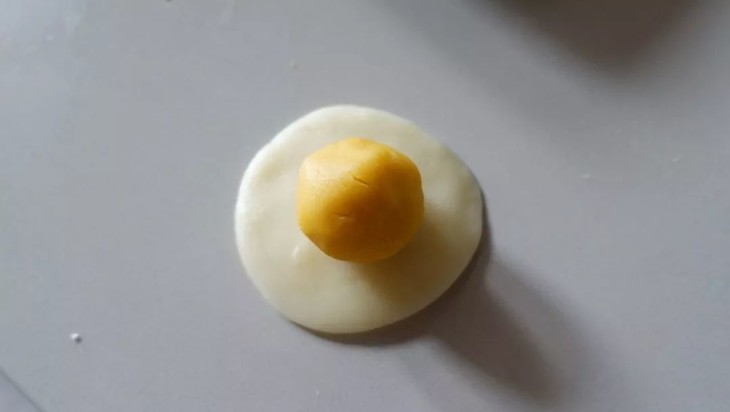 皮压扁,将馅料放中间,进行包裹,包裹紧实