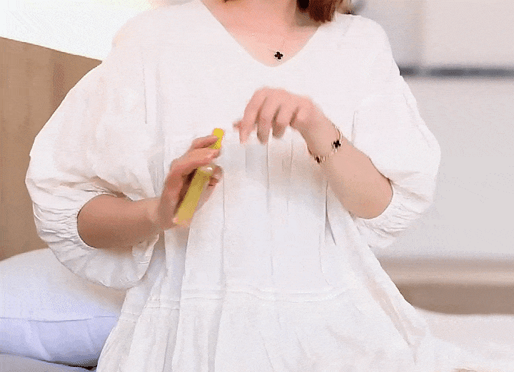 在手上轻轻揉搓,涂抹在裸露的皮肤上就可以,吸收很快不黏腻。