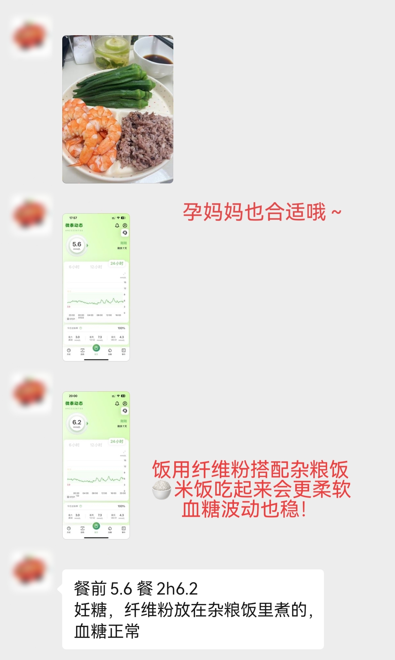 💁孕妈妈亲测分享:秋葵+小龙虾+和纤维粉一起煮的杂粮饭,餐前5.6,餐二6.2👍