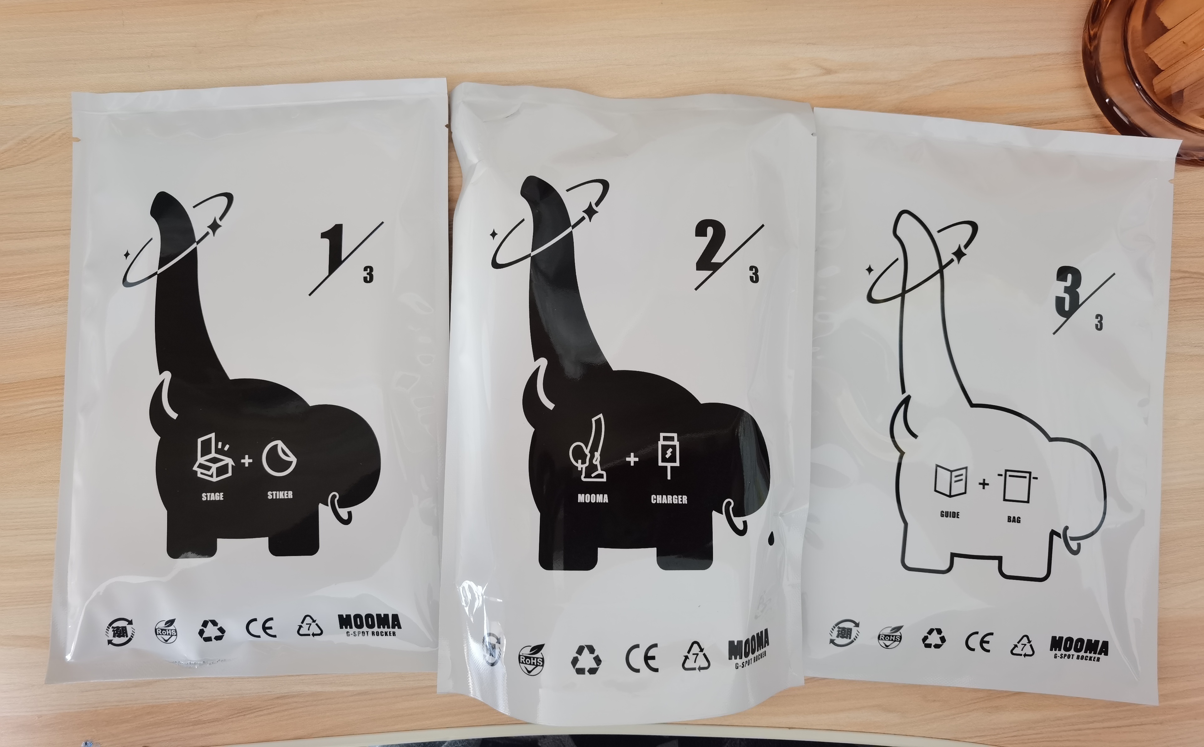 开封之后,里面是三个白色独立密封的袋子,分别装了场景卡片、贴纸;小象本体、充电线和小象的耳环;使用指南、收纳袋。这里要点名表扬独立密封包装,真的非常非常私密,满满的安心。还有就是配色真的非常非常非常用心,打开塑封纸和绿色的封口签,当掀开盖子那一刻,入眼是纯黑的箱体里整整齐齐的三只白色小袋子,天蝎座真的超爱这一挂,充满了神秘的高级感和秩序感。(小编:有没有盲盒那感觉了)
