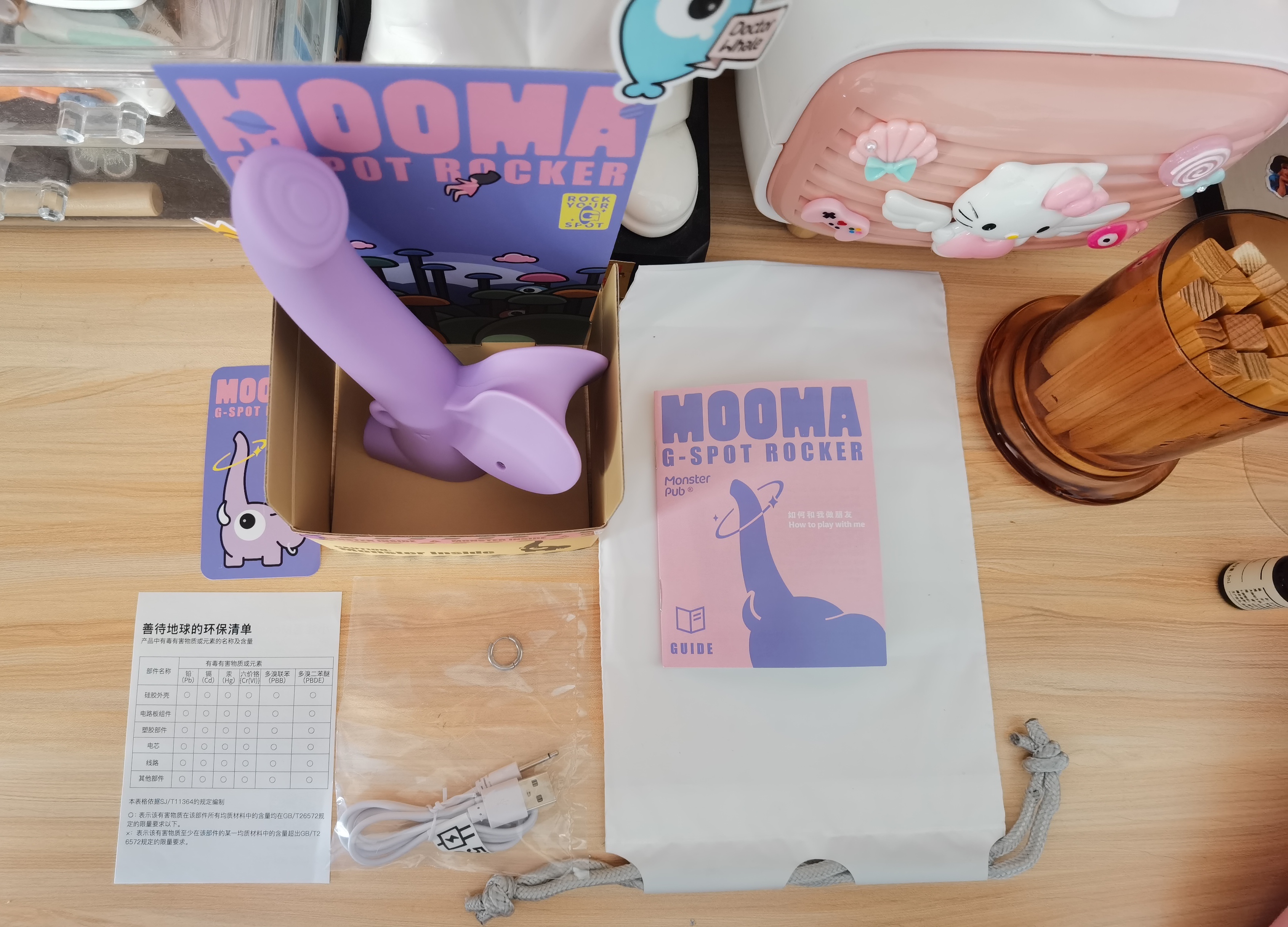 (由于贴纸过分可爱,拆开后马上被我挥霍一空,所以无法出镜。)(实不相瞒小编贴了自己一整个电脑都是) 从左到右依次是,小象个人名片、象和场景卡片盒、质保服务卡、充电线和小耳环,还有使用指南和收纳袋。 这里一定要点名使用指南,含中文简体繁体以及英文、日文、德文、法文、俄文等九种语言的使用指南,厚厚的一个小本子,你不仔细阅读都会觉得糟蹋了官方的心意。 使用指南开篇是小象中英文的个人介绍,不得了哦这个象,是有才华的小象。它详细的给姐妹们科普了G点的位置、深度,并且拿捏了G点的小脾气(我悟了,象师傅)。后面的篇幅详细的展示了象师傅的八种打开方式以及它的参数和如何充电、保养、垃圾分类。这里敲黑板,小册子一定要看姐妹们,干货太多啦!提醒提醒,象师傅的尺寸:175mm×93mm×49mm 收纳袋已经被很多姐妹吐槽过了,塑料材质无论从视觉,触感还是使用体验都失去了绒布袋的高级感,唯一的好处大概就是防水。