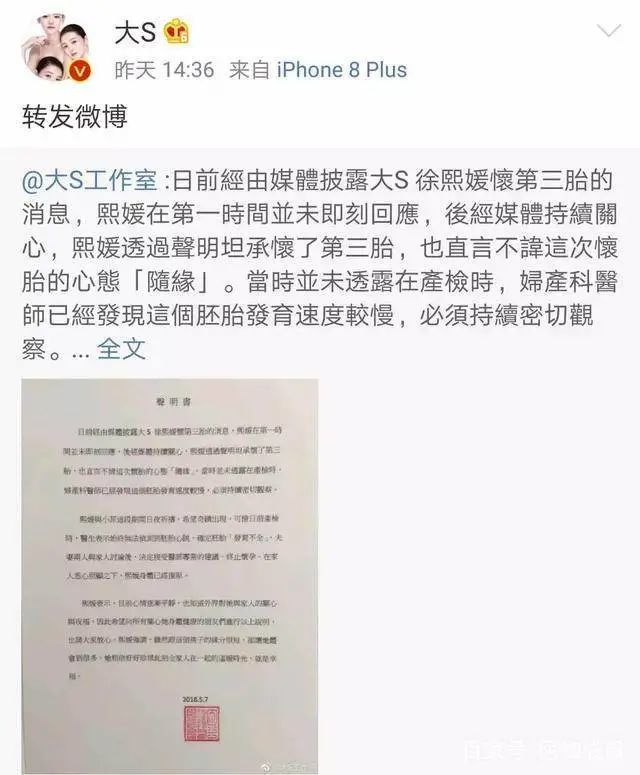 大S在41岁高龄怀上三胎,在孕7周时因产检始终听不到胎心,怀疑胚胎发育不良,在医生的建议下无奈终止怀孕。