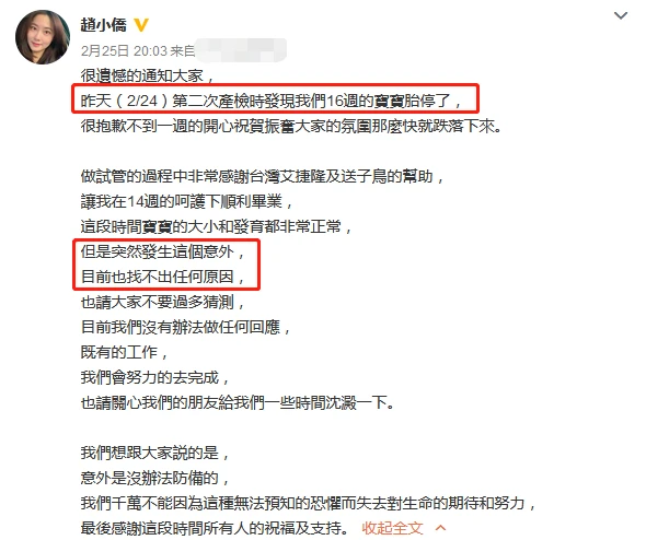 台湾女星赵小侨为怀孕前后打针不下100次,终于在41岁怀孕,可仅仅在孕16周时,遗憾宣布胎停。