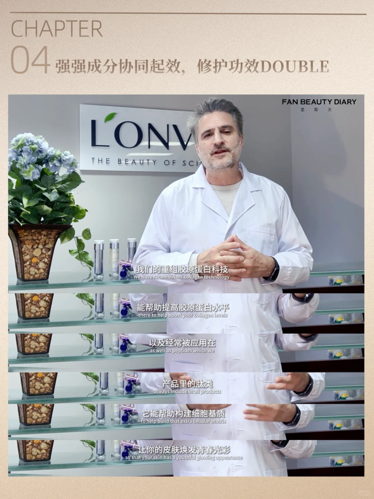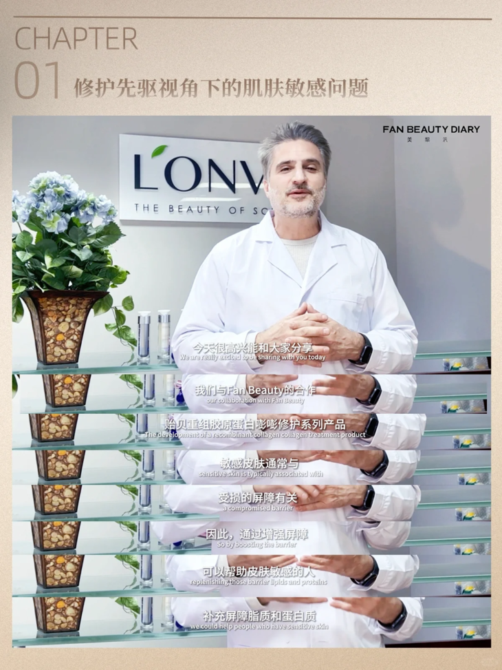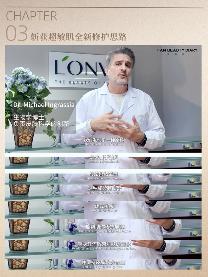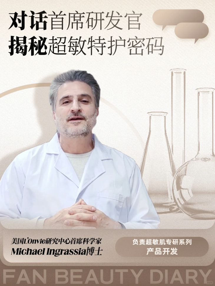 在超敏线的产品研发上,Fan Beauty Diary联合权威生物学博士——美国L’Onvie研究中心首席科学家Michael Ingrassia👨🔬,将消费者肌肤诉求置于首位,秉持对产品极致追求的理念,独创「贻贝粘蛋白」➕「重组胶原蛋白技术🧬」的科技复配,在修护屏障、抑制炎症的同时促进胶原再生,紧致重塑肌肤。