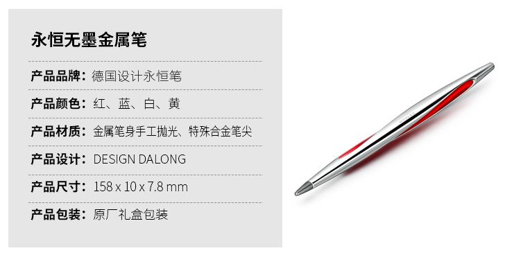 更是那些学生们的福音,有了这样的永恒笔之后,笔袋里再也不用永远装着笔了,随手拿着这支笔,在考试的时候也不用担心笔会突然写不出来~