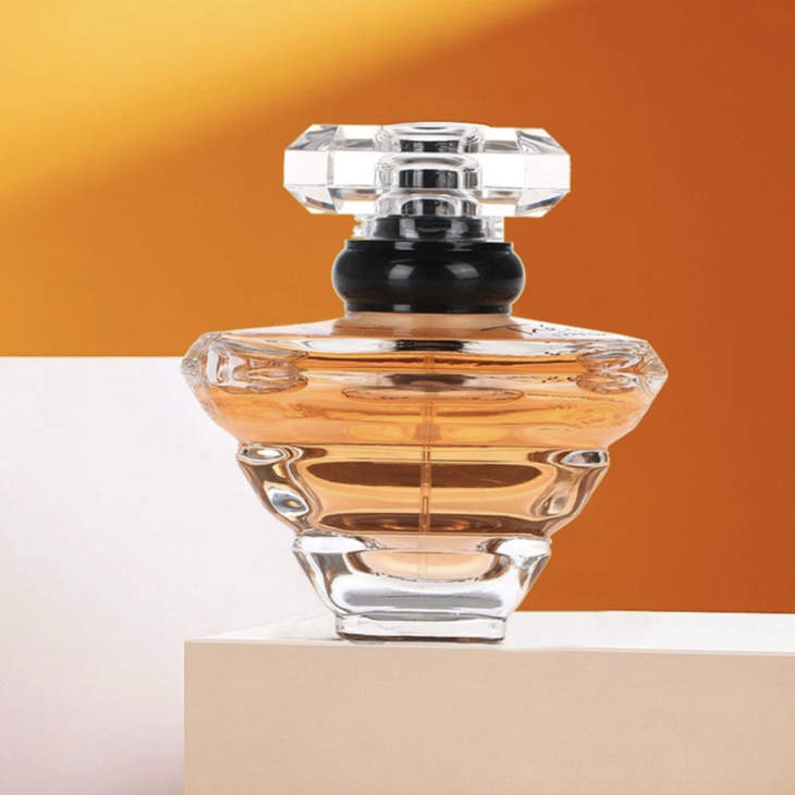 瓶身晶莹剔透,如同一座倒立的金字塔,棱角圆润,绝佳地呈现了瓶体和里面琥珀色的香水液体。