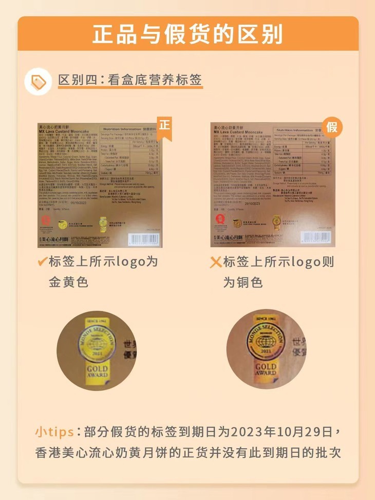 小tips部分假货的标签到期日为2023年10月29日,香港美心流心奶黄月饼的正货并没有此到期日的批次。