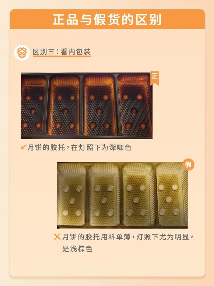 正品的月饼胶托,在灯照下为深咖色;假货的月饼胶托用料单薄,灯照下尤为明显,是浅棕色。