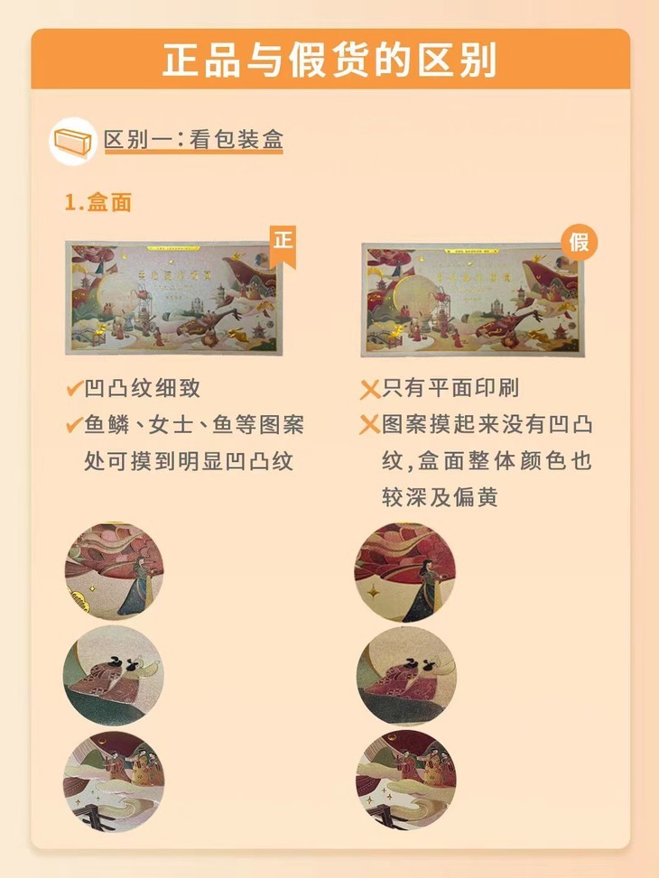 ①盒面:正品凹凸纹细致,鱼鳞、女士、鱼等图案处可摸到明显凹凸纹;假货只有平面印刷,图案摸起来没有凹凸纹,盒面整体颜色也较深及偏黄。