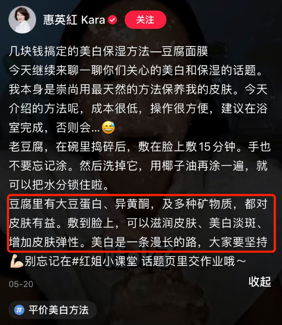 但惠英红在文案里解释了,她说豆腐里有大豆蛋白、异黄酮,及多种矿物质,都对皮肤有益,敷到脸上,可以滋润皮肤、美白淡斑、增加皮肤弹性……