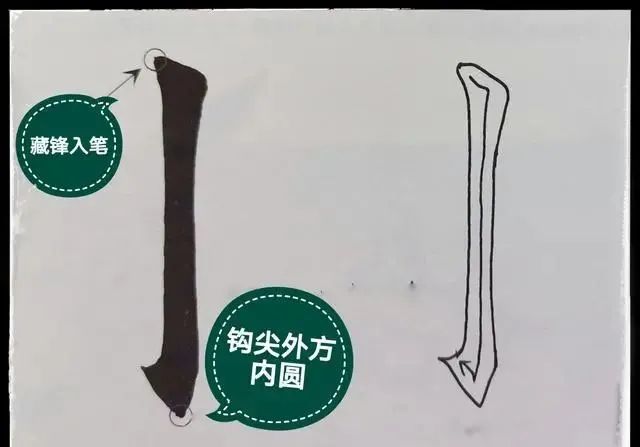 能否写好钩尖,是毛笔书法功底的直接检验。无论是写竖钩,竖弯钩,还是戈钩,或者卧钩,钩尖写不好,基本就算败笔了!也暴露了笔者的书法功底。比如,竖钩,戈钩的写法,其钩的部位应该是内圆外方,如下图。钩尖可长可短,根据笔画需要来写。