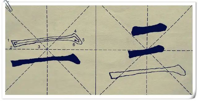 这是很多初学者常见的败笔之处。写毛笔字与写硬笔书法是有所区别的,这种区别就是切笔入纸角度严肃性不同,硬笔书法,要求不高,但毛笔不一样。比如长横画,切笔入纸的角度是45℃左右比较合适,如下图横画。而且,切入过程是先轻后重,顿笔折锋后再向右铺笔,然后中锋行笔。
