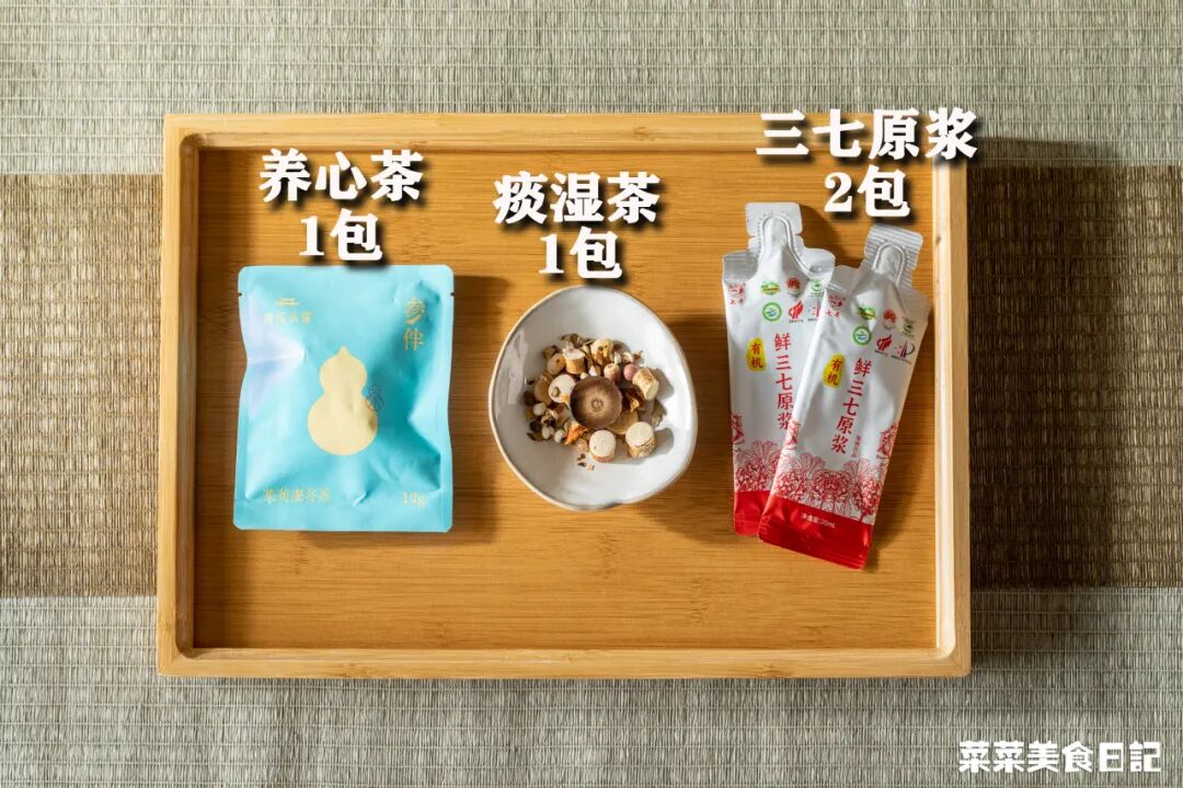 每日用量:养心茶1包+痰湿茶1包+红参1-3片,鲜三七原浆2条