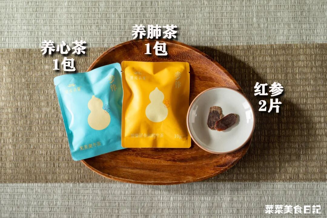 每日用量:养心茶1包+养肺茶1包+红参1-3片