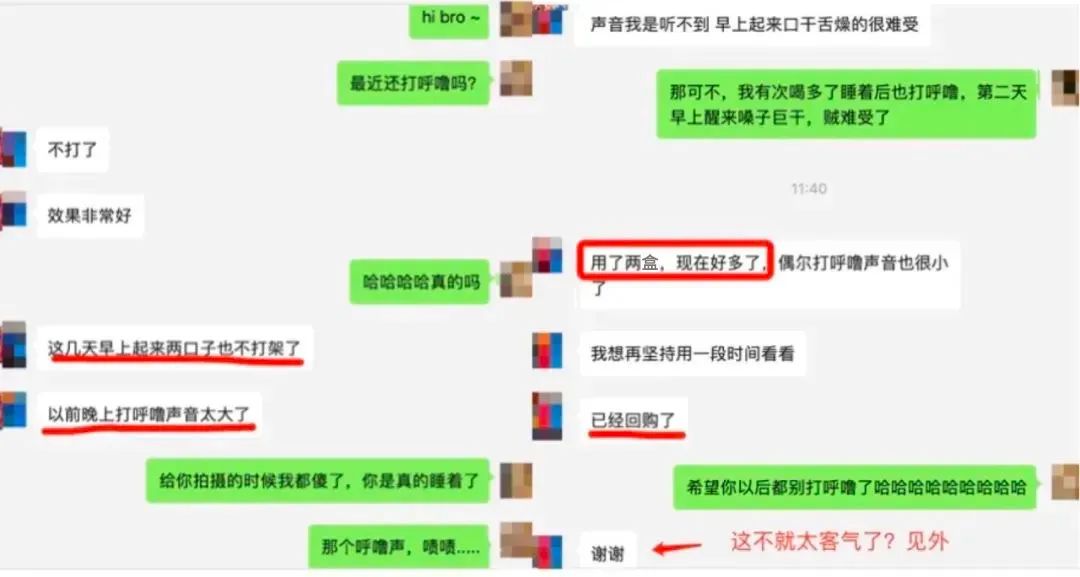 同事小陈看到这个后很激动,当天晚上就拿回去用了。用完2盒后他来反馈:晚上真的不打鼾了,女朋友再也没有抱怨他晚上打呼!