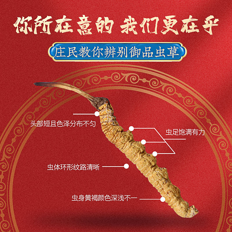 庄民的冬虫夏草每颗来自原生态高海拔雪域,虫体饱满,草头短脆,色泽自然,纹理清晰,品质更精细。所有虫草采用的都是零下43°C瞬鲜冻干工艺,采用的都是零下43°C瞬鲜冻干工艺。为的就是保持原有新鲜口感和原有营养不流失,让每一位食用冬虫夏草的人都能尝到原有的虫草“风味”。
