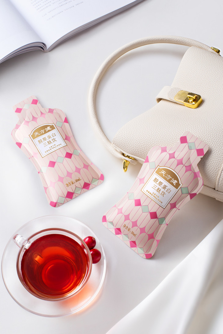天方健「胶原蛋白三肽饮」富含鱼胶原蛋白肽(添加量:5500mg/袋)、胶原三肽(添加量:1500mg/袋)、鲣鱼弹性蛋白肽(添加量:10mg/袋)、银耳多糖、米糠油粉等等美容养颜的好料,同时还添加了蔓越莓浓缩汁、红石榴浓缩粉,喝起来酸酸甜甜的,很好入口,易于坚持!