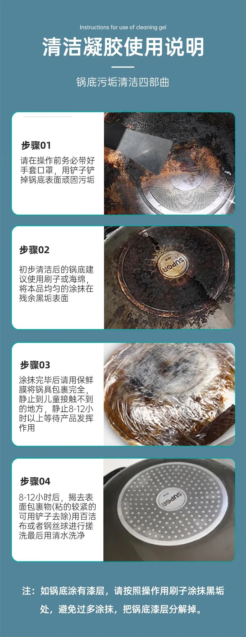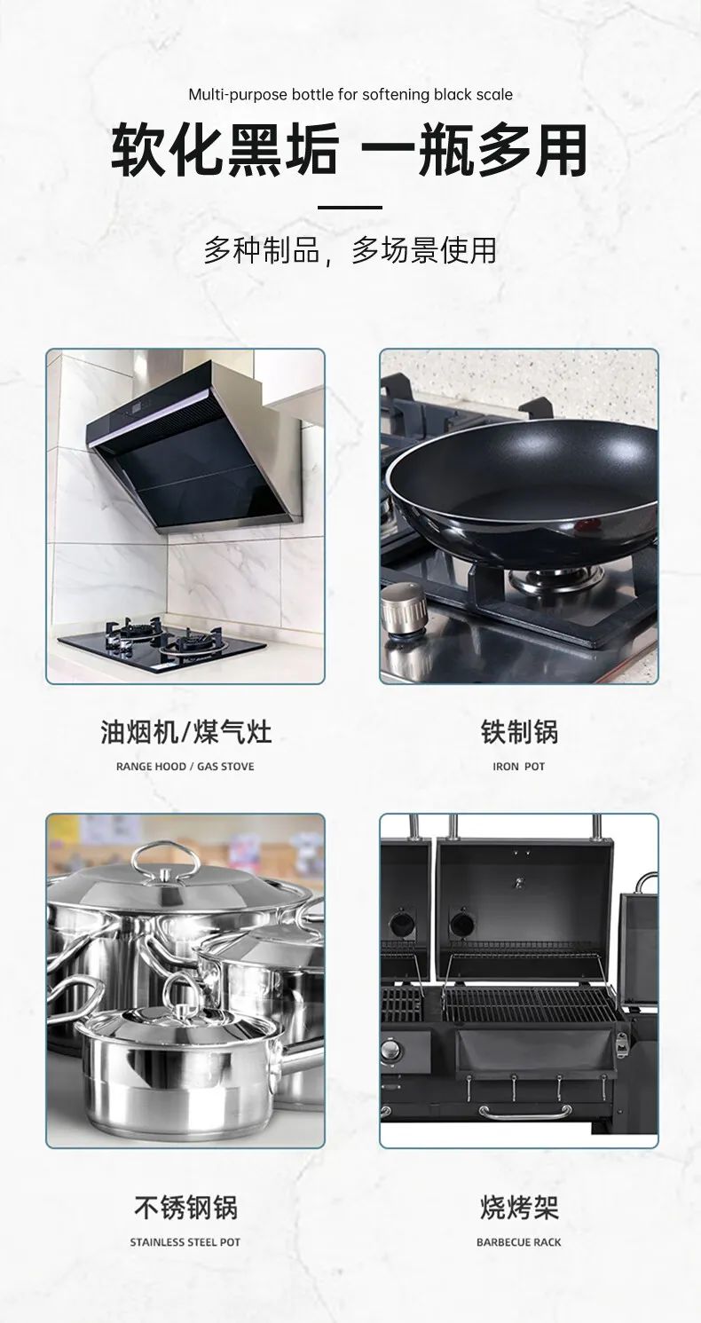 有效渗透入锅底黑垢内部,并从根源上分解黑垢,持续反应,使黑垢内部结构疏松分散,省时省力,轻松去垢。