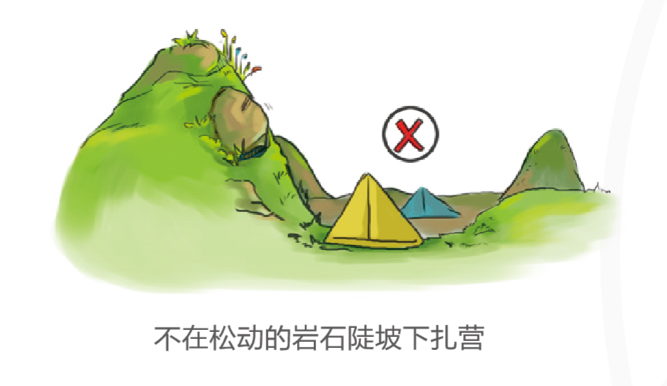 此外,在选择露营地时,也要考虑落石风险。在遍布松动岩石的陡坡下不要扎营,在这种地方扎营,很有可能在夜间有落石直接砸向你的帐篷。
