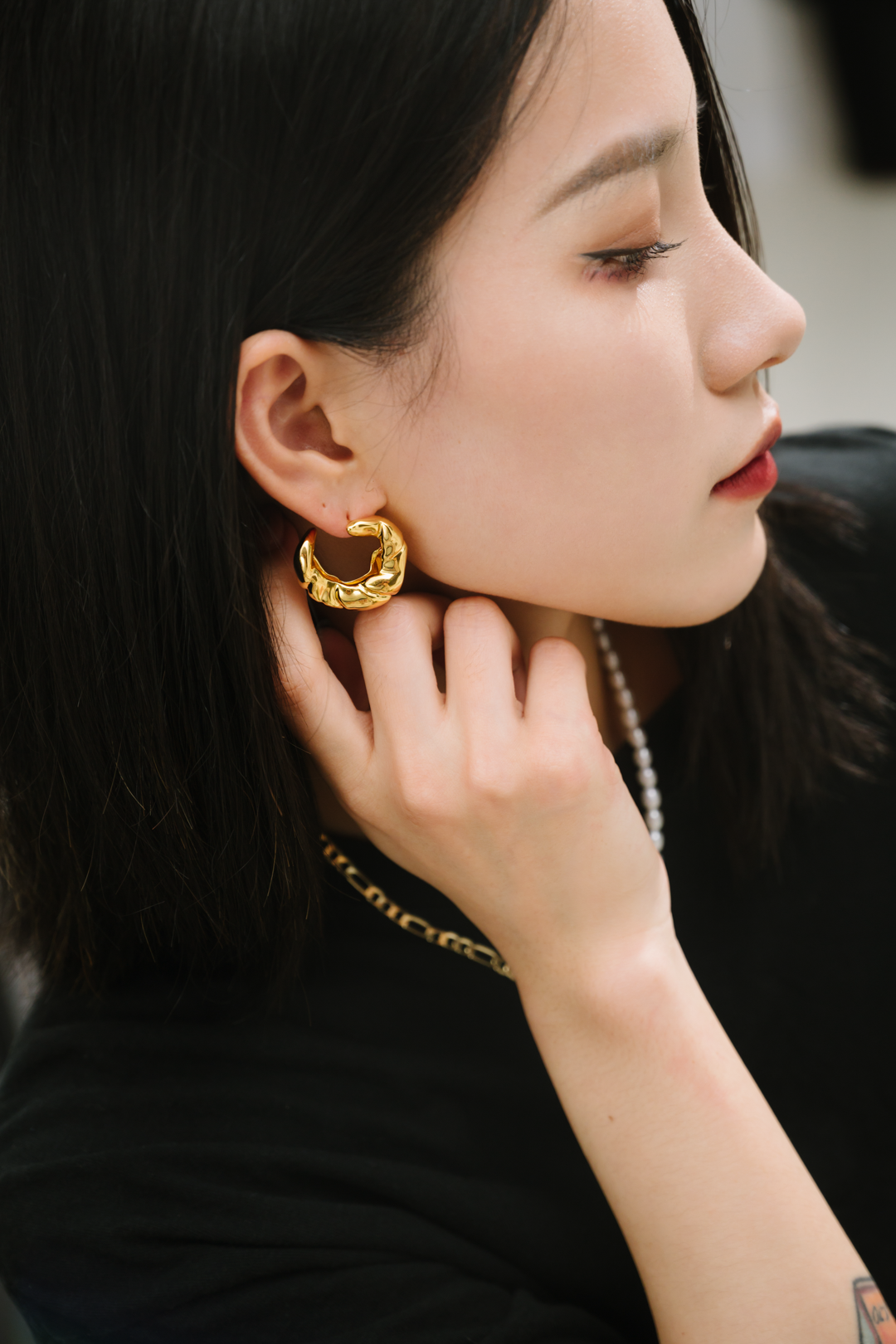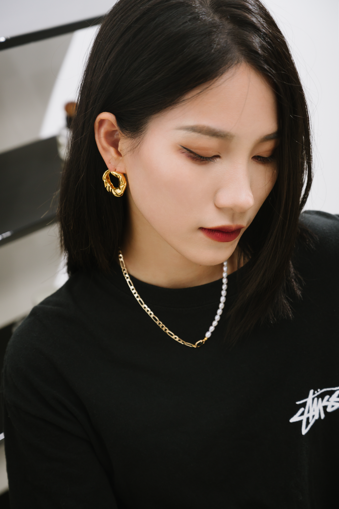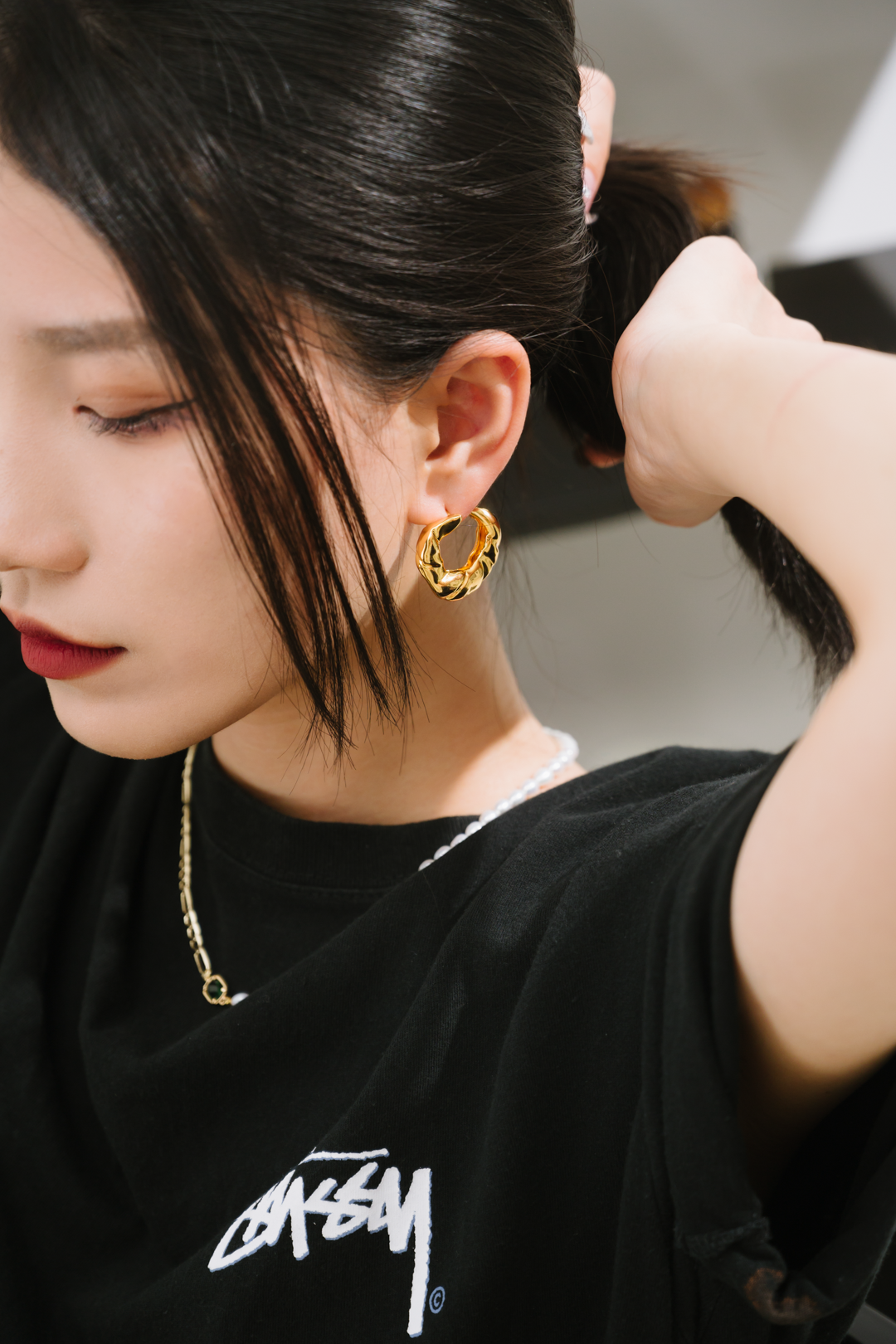 涵诗戴了同品牌的牛角包耳环,简单说一下。它在经典hoop耳环的基础上多了肌理的设计,ins很多走极简风、大女人风的时尚博主很爱戴,简单搭配就能增加时髦感。