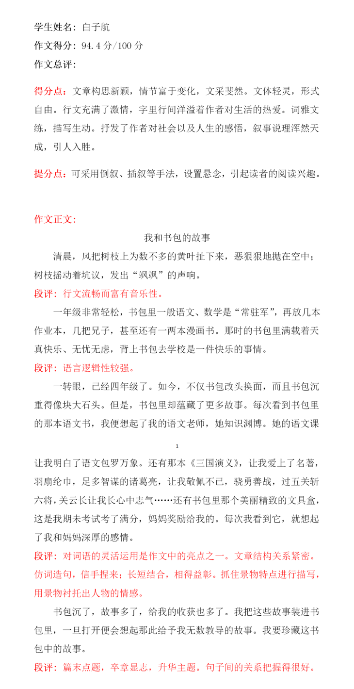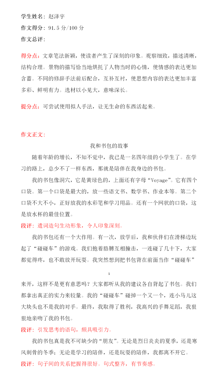 赵泽宇同学平时热爱阅读,喜欢在文字的世界里感受并抒发自己的喜怒哀乐。这篇文章以我手写我心,在平日的细心观察中加入了自己的真情实感,表达了和书包之间深厚的友谊。文章逻辑严密,遣词造句颇有匠心,以小见大,笔法精妙,不失为一篇佳作。
