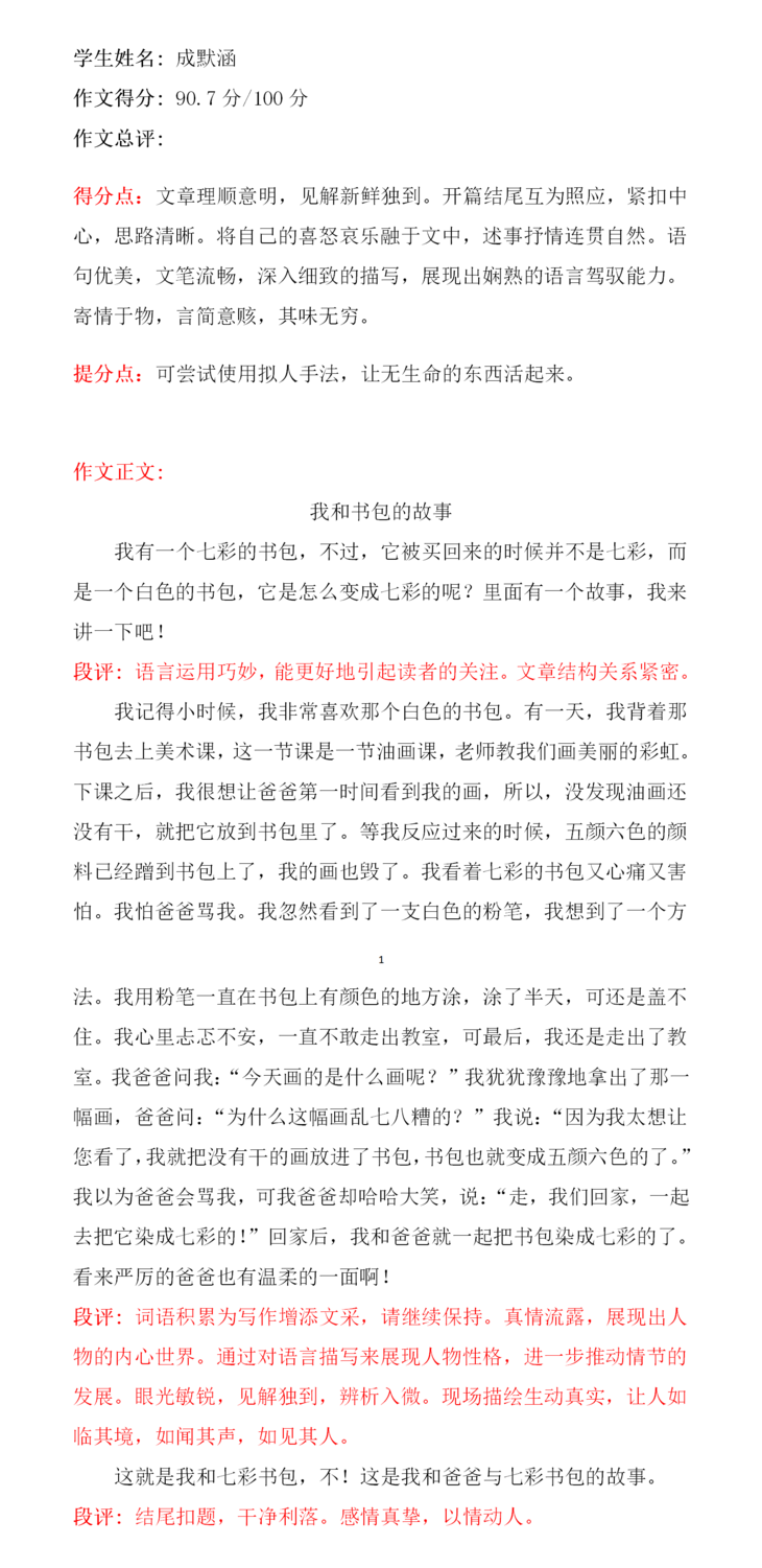 这篇文章最动人的地方,就是“真”!相信你和爸爸的七彩书包,至今还被珍藏吧,虽是小事儿但“真实”最为可贵。文中你的心情忽而喜悦忽而、忽而担心、忽而释然、温情脉脉,“情真”就是最能打开读者心灵的钥匙。事“真”,情“善”,文“美”,加油吧少年!
