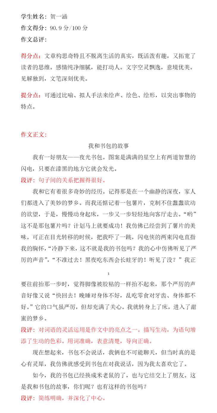 贺一涵同学平日里就是一个热爱读书、酷爱写作的孩子。他的这篇习作源于生活,将故事情节融入自己天马行空的想象中,用简洁的话语传达出了自己真实的感受。以丰富的想象力、极具新意的构思向我们介绍了自己与书包的奇妙旅程,令人愿读、爱读,不忍释手。