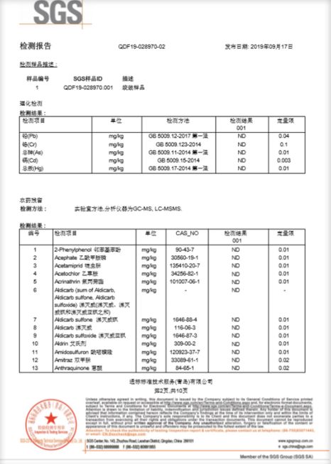通过SGS265项农残与重金属检测