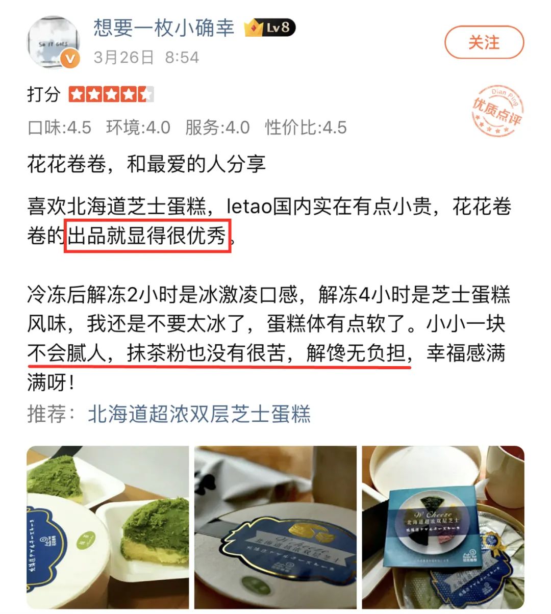 不光是试吃组一致好评,它家的北海道芝士蛋糕,大众点评上大家也是疯狂打call!