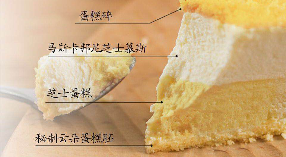 蛋糕碎+芝士慕斯+芝士蛋糕+秘制云朵蛋糕胚