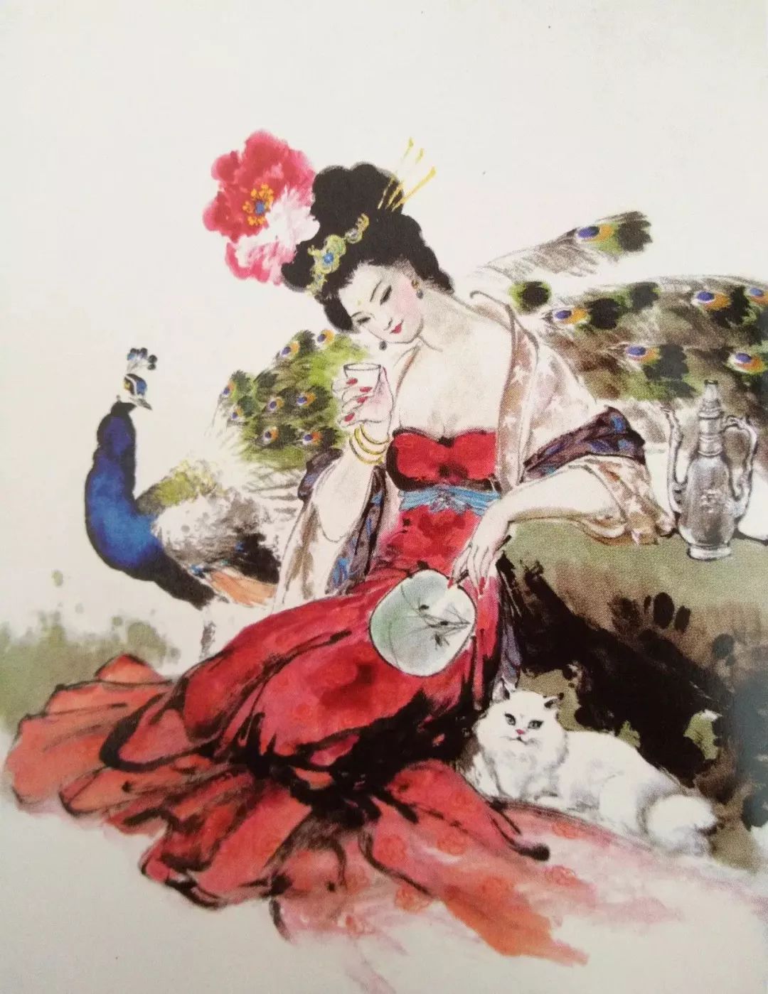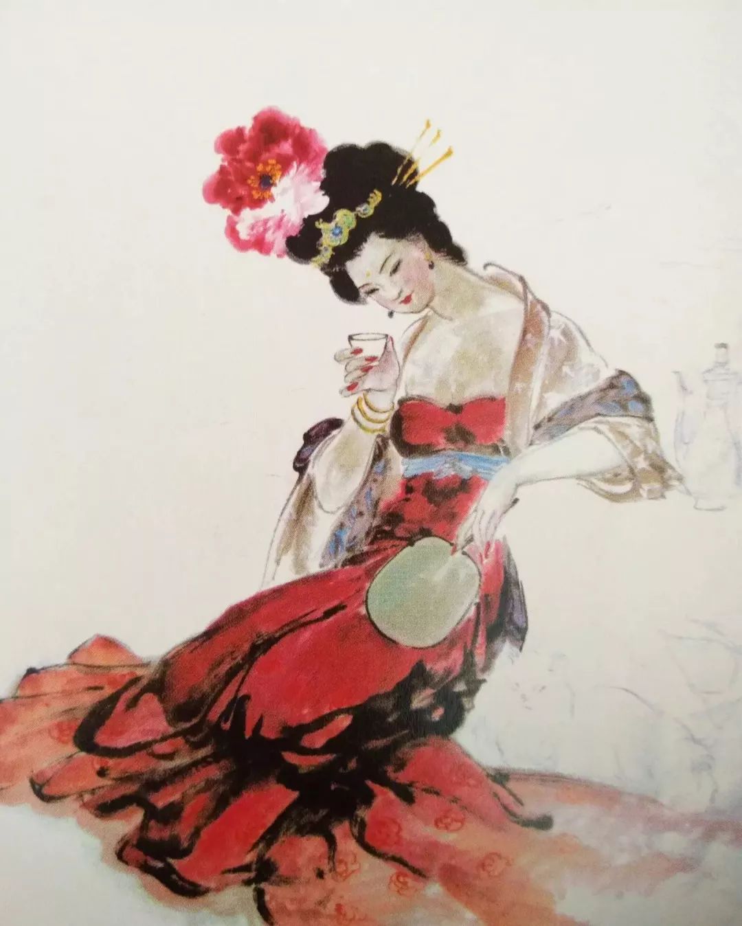 3、以朱砂兑石绿为基调染肤色,脸和手心趁潮加染淡曙红。为达到贵妃雍容华贵的效果,衣饰、花纹可画得繁密些,局部加点金粉。