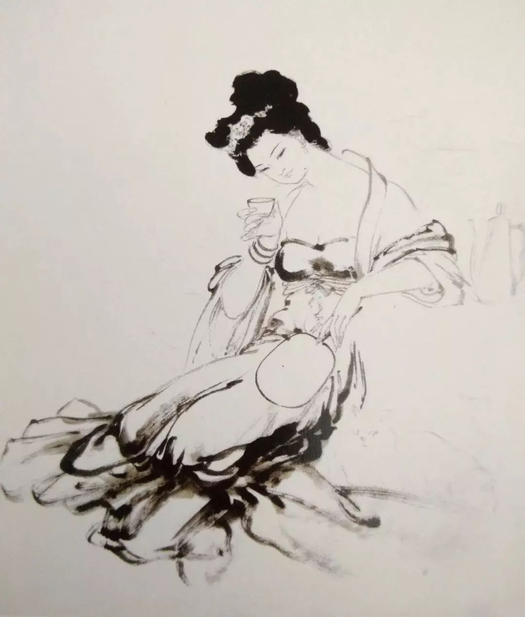 2、用细毛笔勾脸、手和肌肤,用大笔勾衣裙。保持松动,与较工的脸与手形成对比。