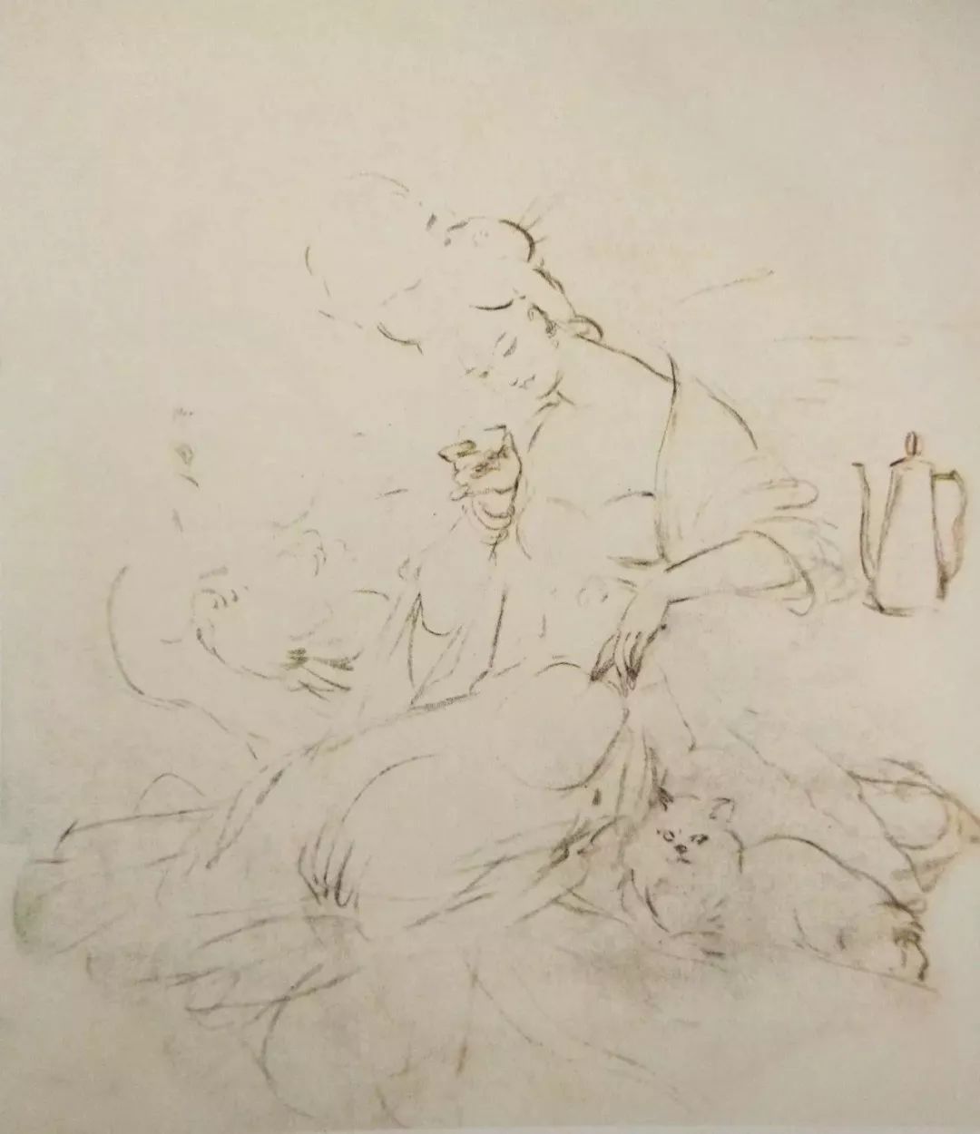 1、木炭条起稿。注意表现人物的结构动态,略带忧郁的神情,以及与配景孔雀、白猫的位置关系。