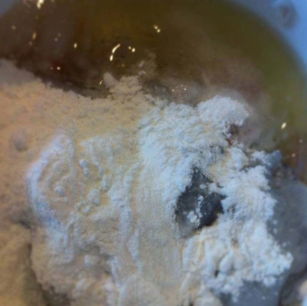 2、打入1个鸡蛋,与腌制好的虾仁搅拌均匀,放入1两淀粉,1勺色拉油,挂上糊;