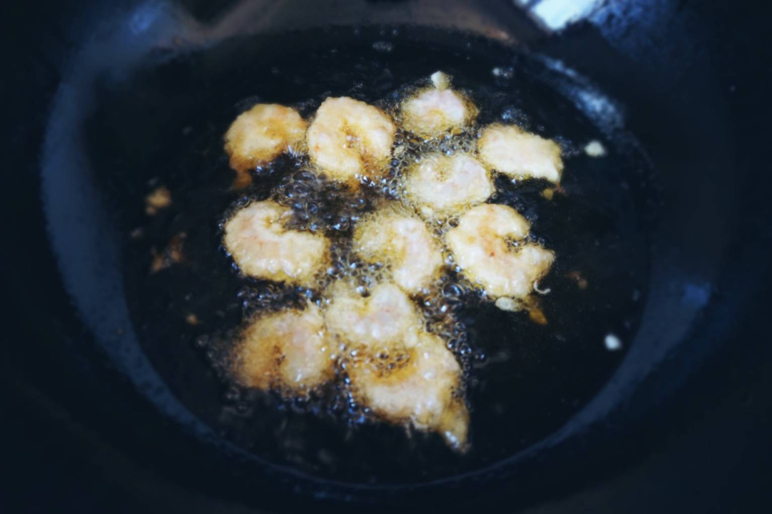 3、都捞出来后,把油温升高,再次倒入虾仁,闯炸一下,虾的鲜味就出来了;