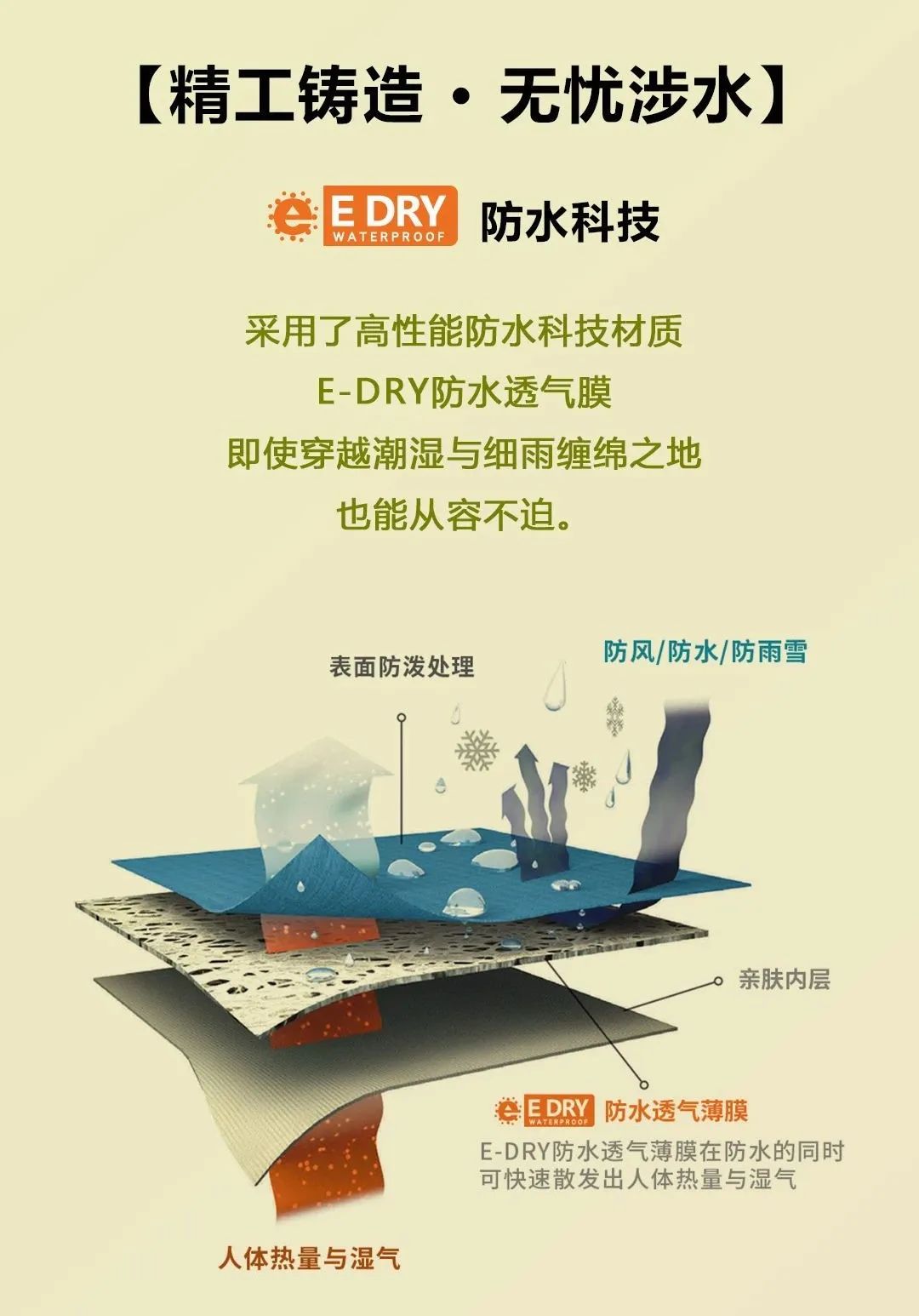 E-DRY防水膜是一种E-PTFE膜,其微多孔比水分子小,比湿气分子大,可透出湿气阻隔雨水,质感轻易,穿着轻便舒适不厚重。