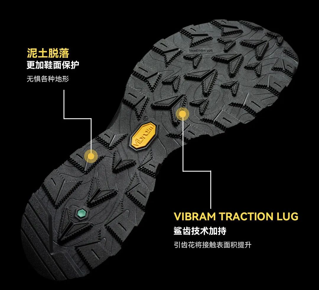 VibramTraction Lug 鲨齿技术的创新设计牵引齿花将接触表面积提升,增强了稳定性和牵引力。轻松应对各种户外路面,提供无与伦比的推动力和制动力。
