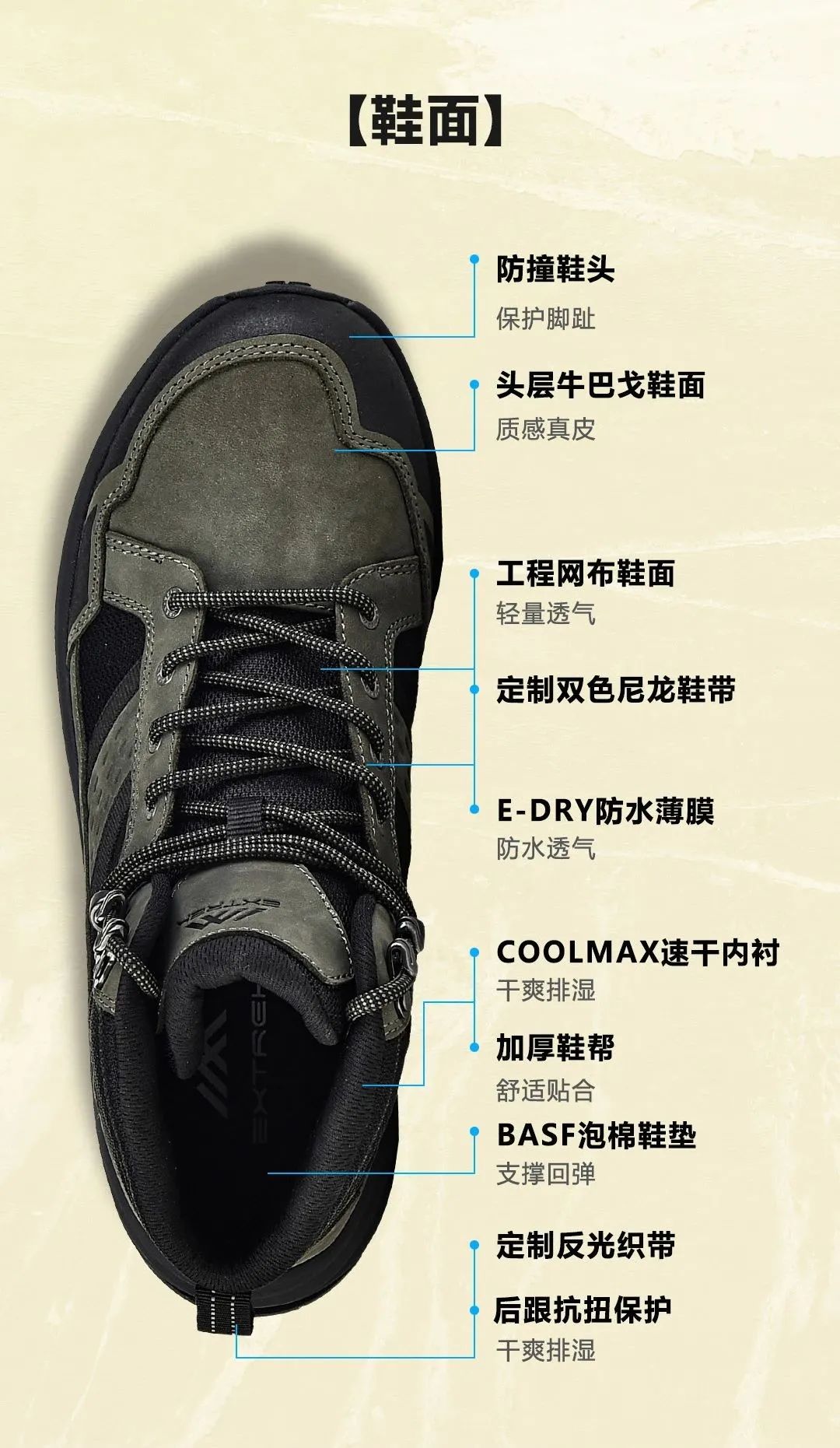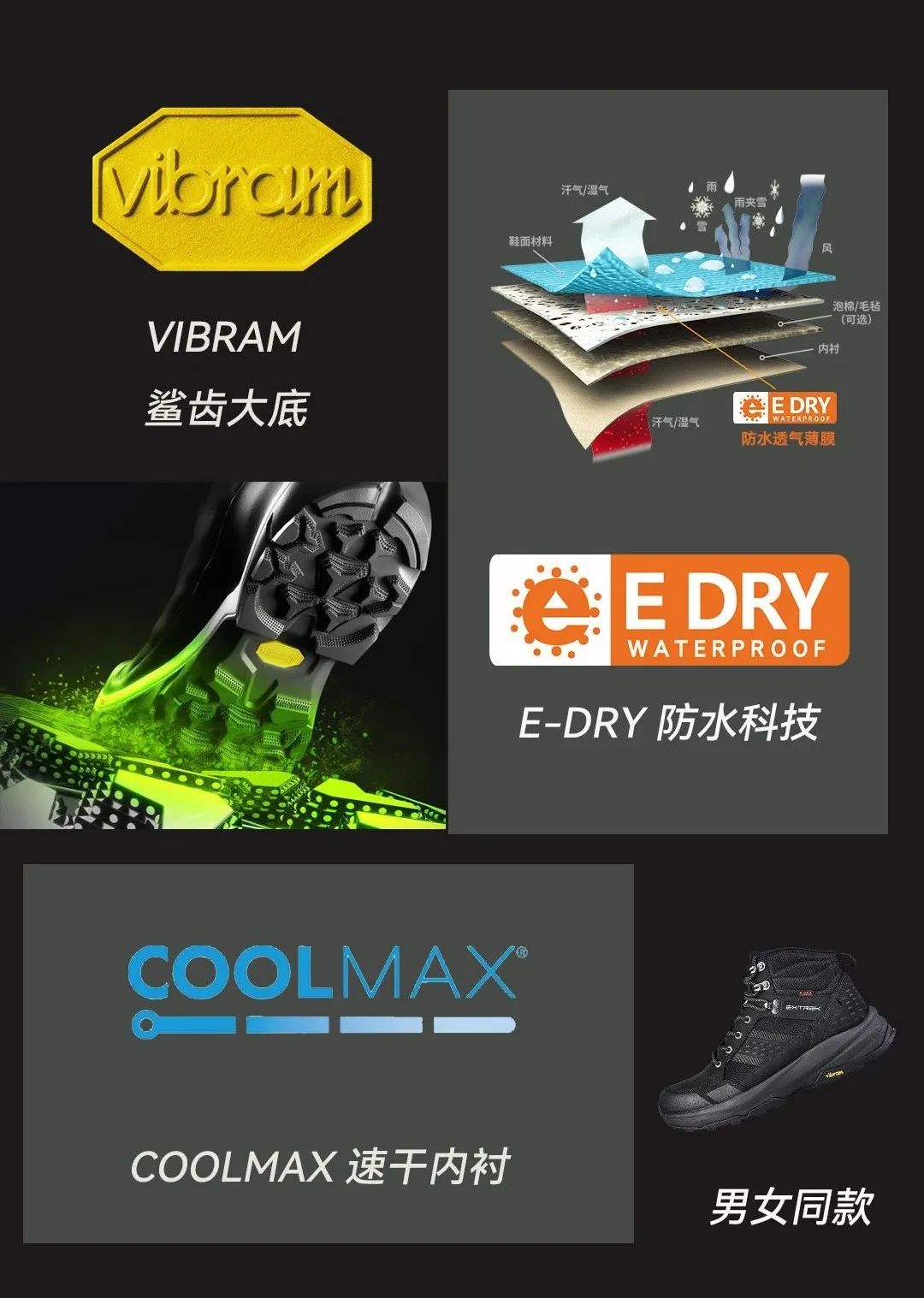 特别引入E-DRY高科技防水膜,有效保持内部干燥清爽,即使遭遇突如其来的恶劣天气也不用担心脚部进水,给予双足最舒适安心的呵护。一如既往配备VIBRAM防滑大底及防撞设计,提高抓地性和耐磨性,以适应各种复杂地形。