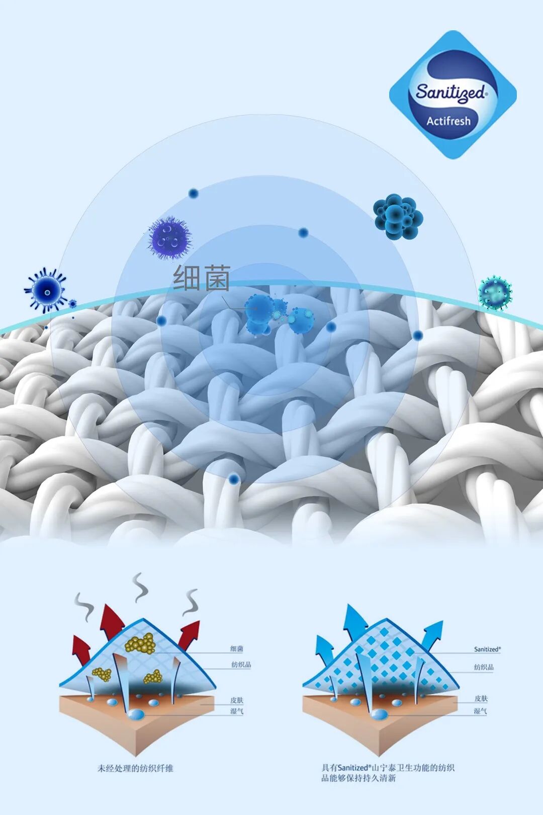 野外环境,极易滋生细菌,天越引入了瑞士山宁泰Sanitized抗菌保护技术,使其持久清新,护足健康。
