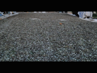 (把艾叶铺放在院子里进行晾晒,让水分慢慢蒸发,一只小鸡突然闯到镜头里。)
