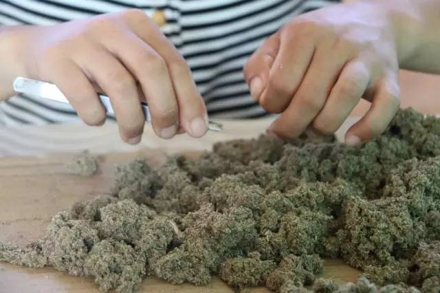 虽然市场上流行30:1(指30斤艾草加工出1斤艾绒)以上的艾条,但经过研究,团队还是选择10:1的艾绒来做出艾条。
