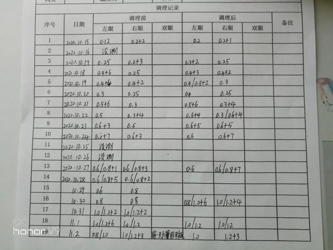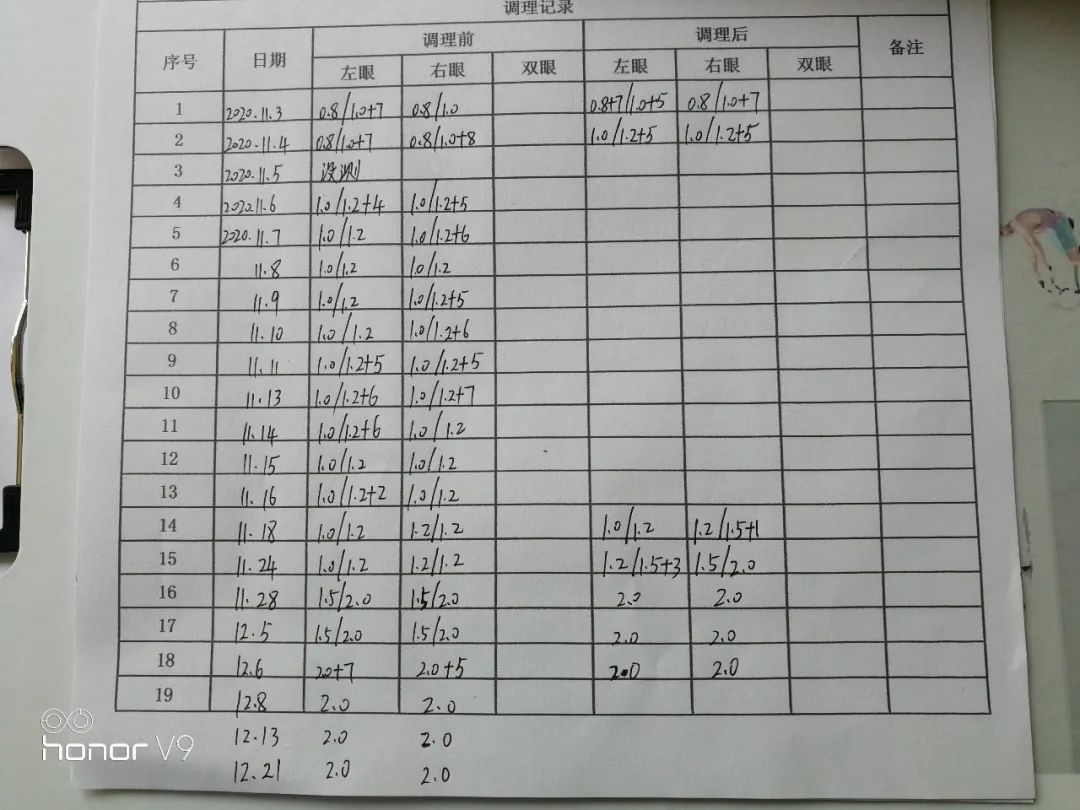 从这个记录表中可以看出孩子的视力是一直在提升的,在1.0、1.2的时候停留了一段时间,反反复复的。我知道这是脏腑功能太弱了,它需要一个时间来修复,时间到了它自然就提升了。