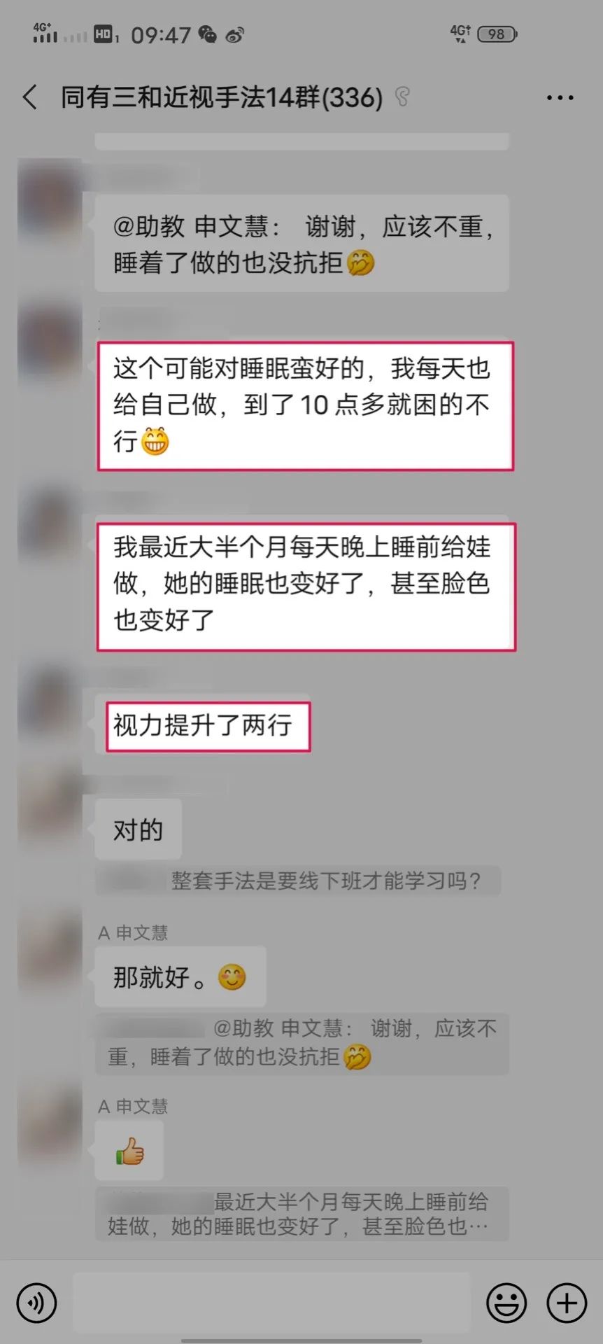 起初妈妈也是做好了长期与近视奋战的准备,抱着只要能维持住不下降就好的想法来尝试,结果在坚持了手法一段时间后,听孩子说坐在最后一排,不戴眼镜也能看清楚时,她被深深地震惊到了。