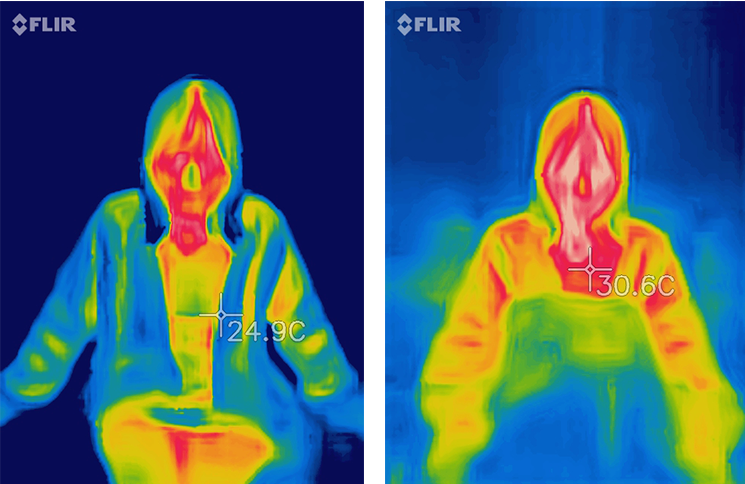 原本身体表面24℃,一穿上羽绒服,身体就上升到了30℃。