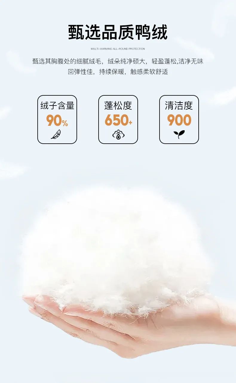 1.90%含绒量,轻盈保暖不压身,蓬松度高,手感软糯,回弹性好。