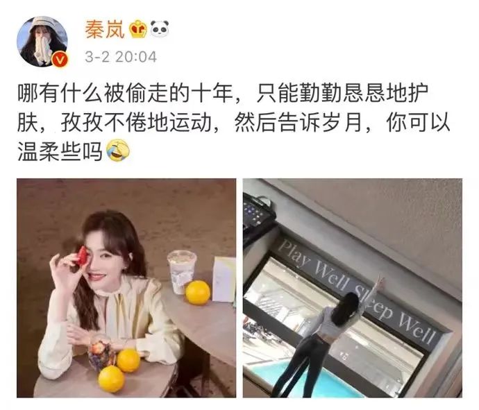 她的美自成一派:笑起来甜美、没有侵略感,给人感觉很舒服。不硬凹少女人设,身上却还保留着一些“女孩”的感觉。即使是大姐姐人设,也是那种温柔到可以激起你保护欲的姐姐,这样演出来的姐弟恋,谁能忍住不嗑。其实岁月对谁都是公平的,只是女明星在护肤保养上面下的功夫更多而已。秦岚之前还发微博称,哪有什么被偷走的十年,只能勤勤恳恳护肤,孜孜不倦运动。